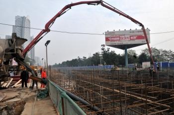 13日上午,記者在市勝利路口下穿隧道施工工地看到,一臺(tái)混凝土汽車輸送泵,將混凝土抽吸入下穿隧道靠近江邊一側(cè)的主框架底板的鋼筋骨架里,建筑工人再將多輛商砼車混凝土直接澆筑到主框架底板里,一些工人也在編扎主框架鋼筋為澆筑混凝土作準(zhǔn)備。