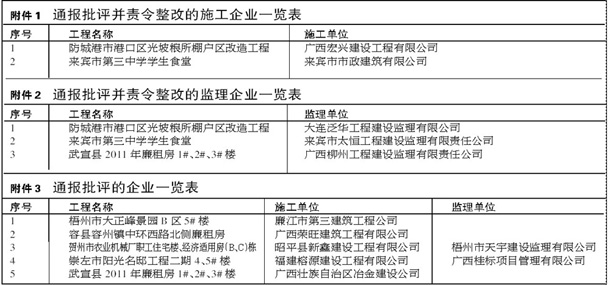 同時,對施工現場存在質量安全隱患且未按時完成整改的兩家施工企業(見附件1),對未按時完成整改的兩家監理企業和1家屢查屢犯的監理企業(見附件2),予以全區通報批評。在整改合格前,施工企業和相關管理人員在廣西境內不得參加工程投標、不得承接新的工程業務。對存在較多質量安全隱患的5個工程項目涉及的5家施工企業和兩家監理企業(見附件3),予以全區通報批評。