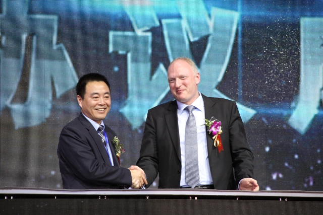 中聯重科陳曉非與奔馳公司代表簽定戰略合作協議后握手慶祝