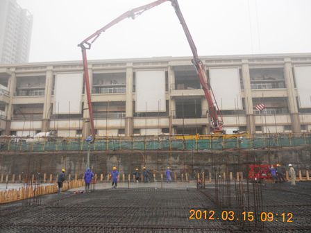 為避免雨季施工帶來的影響,項目經過精心策劃,修改方案并進行專家論證,采取膨脹加強帶取代后澆帶施工方案,根據實際情況制定詳細的施工計劃,合理進行流水段的劃分并保證了混凝土的及時供應,順利完成了底板混凝土的首次澆筑,共澆筑混凝土約2500立方米,為在四月初完成地下室結構施工打下了堅實基礎。