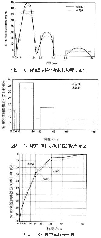 將表3、表4中A、D和B三組水泥顆粒級配數據,分別繪制成水泥顆粒頻度分布圖(圖2和圖3)和累積分布曲線圖(圖4)。