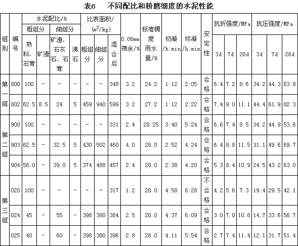 3.細組分中沸石比例相對較多,故粉磨的比表面積控制較高。對不同的混合材應控制不同的比表面積(見表6)。