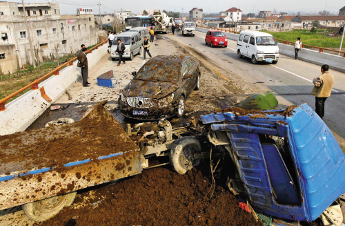 兩輛微型面包車后方幾米處,一輛水泥攪拌車和一輛K161路公交車(平湖-嘉興)緊貼在一起。水泥攪拌車車頭朝東,車尾朝西。公交車車頭朝西,車尾朝東。公交車緊貼攪拌車一側車身的幾扇窗戶玻璃粉碎,另一側車身挨著護欄。攪拌車左側車頭受損嚴重,地面上滿是機油。公交車上的兩名乘客和攪拌車司機洪某只是受了點皮外傷。