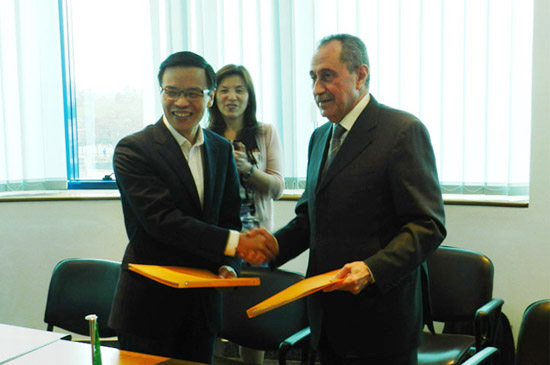 Les Cement水泥公司董事長Laffalel Layousse, 中材國際副總裁童來茍,CESA董事長分別代表業主、總承包商和咨詢公司在合同上簽字。