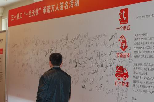 作為本次活動的重點展示和推介內容,三一重工“一生無憂”服務承諾也于承諾頒布即將一周年之際開展了承諾萬人見證活動?;顒蝇F場邀請客戶共同參與服務承諾互動活動,贏取ipad2大獎?;顒蝇F場領導及客戶還共同參與了“一生無憂”萬人簽名活動,一名幸運客戶贏得了參觀三一大象廠區既歐洲游資格。