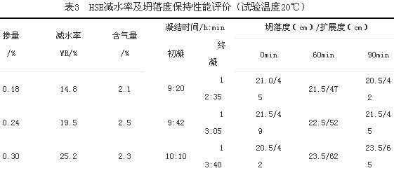 表3實驗結果表明:初始凈漿性能和混凝土性能之間沒有明顯的相關性,摻HSE的凈漿即使不流動,但仍然具有20%左右的減水率。凈漿損失和混凝土坍落度損失之間具有良好的相關性。按照JC473-2001《混凝土泵送劑》標準進行檢測,新拌混凝土但隨時間的延長,不但坍落度增加而且擴展度也是增加。