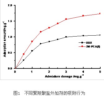 聚羧酸鹽外加劑主鏈化學結構中含有大量羧基、磺酸基負離子提供電斥力和吸附點,含有聚乙二醇長側鏈提供空間位阻效應,其分散性能的高低和坍落度保持能力和聚合物的吸附密切相關。早期吸附快,吸附量大,空間位阻效應強,則初始分散性能強;早期吸附量少,吸附速度慢,則初始分散性能差、但分散保持性能優異。