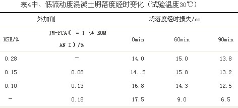 對于大流動度混凝土坍落度保持相對容易,而核電工程往往采用中、低流動性混凝土,對坍落度保持性能要求很高,因此考察中、低流動性混凝土在高溫下保坍性能就具有重要的現實意義。本試驗混凝土配合比為C:F:S:G大:G小:W=290:60:756:680:453:175(C:水泥,F:粉煤灰,S:砂子,G大:大石子,G小:小石子),通過調整減水劑摻量,控制初始坍落度為12~18cm,測定1小時和90min后的坍落度損失情況,試驗結果見表4。實驗結果表明:用HSE高保坍減水劑配置的混凝土雖隨時間的延長,不但坍落度增加而且擴展度也是增加的,但其摻量較高。而相比之下采用JM-PCA( = 1 \* ROMAN I)配制中、低流動性混凝土,在高溫環境下坍落度損失很大,60min已經就損失了50%以上。當摻采用HSE和JM-PCA( = 1 \* ROMAN I)復配可以達到在較低摻量下具有較長時間的坍落度保持能力。