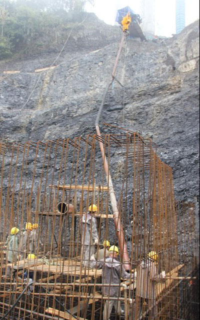 由于龍橋特大橋地處大山峽谷,地勢險峻,兩側拱座斜坡陡傾,落差高達50多米,加上拱座混凝土等級不一致,且斜向分層,模板安裝和混凝土入模十分困難,施工難度非常大;經項目部反復討論和優化施工方案,采用混凝土通過導管滑移入模的方式澆筑,按豎向分層,水平分段,斜向推進的辦法進行灌注及振搗,保證上下層混凝土銜接可靠;龍橋特大橋拱座采用鋼筋混凝土結構,結構尺寸較大,預埋件安裝次數多,總澆筑方量為4378方,屬大體積混凝土,整個拱座共需5次澆筑完成。此次澆筑砼1103方,是恩施側拱座的首次澆筑;導管滑移入模的方式也是項目部針對山區施工特點首次采用,最終成功實施。