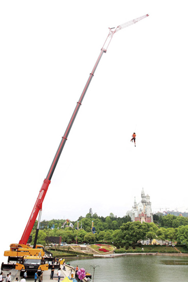 此次“百米極限秋千”空中爭霸賽在長沙世界之窗大型主題文化公園的文明湖上舉行。根據賽事要求,起重機需要把吊臂伸至湖中央,伸長主臂并配合塔臂、懸掛攀巖繩,以形成垂直高度達100米、相當于33層樓高的極限秋千。