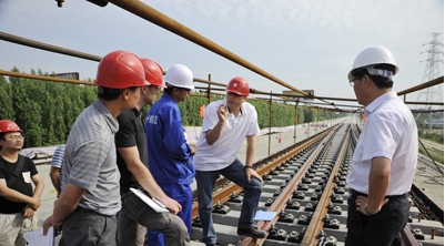 高速道岔包括綁扎道床板底層鋼筋、道岔鋼軌及配件進場、岔枕進場、基樁測設、道岔組裝和調整、道床模板安裝、道床板鋼筋綁扎、道床板混凝土澆注等幾個環節,各項施工準備完成后先后經過監理公司、建設單位、外方監理單位的現場檢測確認。首組道岔一次性澆注道床板混凝土后,進行混凝土養護、現場整理,并進行精度調整,對道岔鋁熱焊接、打磨、整理,同時做好首組高速道岔施工總結及匯報材料,經建設、設計、監理、施工單位及成都工務段共同對施工進行驗收、初評,根據初評意見進一步整理完善內、外業資料,最后迎接鐵道部工管中心的驗收評估,通過驗收后開始大規模道岔施工。
