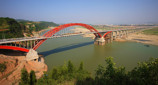 作為我國南水北調丹江口庫區的交通項目和鄖陽再建一條從長嶺新區直達十堰的公路,使鄖縣與十堰融為一體,構建“一江二橋三鎮”發展格局的重要工程的漢江大橋全長2102米,橋寬18米,雙向4車道,采用中承式鋼管砼系桿拱結構,橋面標高183.7米,四級通航標準。兩端接線長1.5公里,總投資25455萬元,由中鐵十五局集團有限公司承建,工期42個月。它的建成不僅實現鄖縣城區南北兩岸最便捷連接,優化以縣城為中心交通網絡布局,并為下一步解決209國道柳陂至十堰段交通瓶頸奠定基礎。屆時,從鄖縣城區到十堰市區僅需十幾分鐘。它將極大地改善漢江沿岸60多個庫區鄉鎮的交通條件、生產條件、生活環境,加快庫區鄉鎮群眾脫貧致富奔小康的步伐。