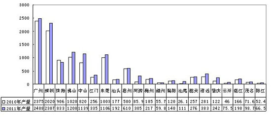 圖2 廣東省2010年、2011年各地市預拌混凝土實際產量(萬立方米)