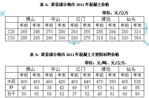 2011年全省預拌混凝土銷售價格基本保持平穩,不同區域之間的價格有升有降,變幅基本保持在20元/立方米以內,其中汕頭市的售價比年初提高了30元/立方米。主要原材料水泥、砂、石子的價格普遍上漲。水泥價格比年初上漲12.9-19.2%,但少數市有所降低,如中山、江門水泥單價下降4.35-8.7%。砂的價格上漲15-87.5%,石子的單價上漲6.9-35.56%。混凝土生產成本增加較大。表2、3為我省部分地市2011年混凝土價格和主要原材料價格: