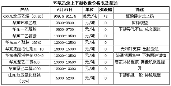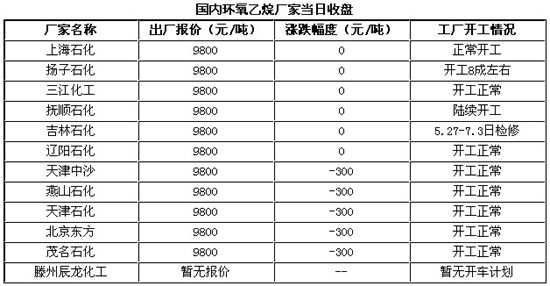 今日,中石化華南公司以及華北公司結(jié)算價(jià)格出臺(tái),以9800元/噸收穩(wěn),屆時(shí)國內(nèi)環(huán)氧乙烷統(tǒng)一價(jià)格均為9800元/噸;之前的謠言化為浮云,業(yè)內(nèi)心態(tài)稍顯放松;當(dāng)前部分工廠適當(dāng)降低負(fù)荷,終端需求仍有待恢復(fù),謹(jǐn)慎觀望中。