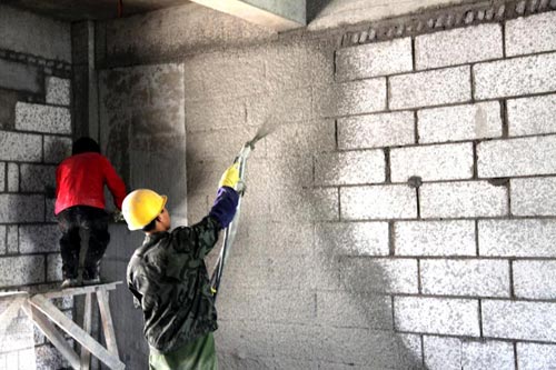 在青島“綠城·理想之城”樓盤,施工單位——寧波住宅建設集團股份有限公司正在進行墻面粉刷機械化施工。施工中采用意大利產“德堡索(TURBOSOL)”牌噴漿機1臺,配備噴漿工1人,抹平工1人,袋裝砂漿及噴漿機搬運輔助工2人。每次投放干混砂漿3袋(與50Kg水泥袋大小相似),濕料制備大約需要3分鐘。第一遍噴刷砂漿-壓網格布-第二遍噴刷砂漿-大杠抹平,15平方米左右的墻面合計施工時間約15分鐘。砂漿層總厚度約15mm。在施工過程中,噴漿機運行正常,噴涂均勻,沒有堵管現象。噴漿施工師傅介紹,機械化施工快捷、方便、質量好、觀感好,無空鼓,無裂縫,施工效率是傳統人工抹灰的7—10倍。
