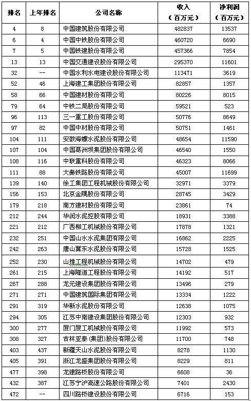 財富中文網日前對外公開發布了“2012年中國500強排行榜”,中石化蟬聯榜首、中石油及中國移動位居該榜第2名、第3名。中國建筑股份有限公司、中國中鐵股份有限公司、中國鐵建股份有限公司蟬聯榜首前十名的地位。中國建筑股份有限公司由去年第8名一躍首次沖入前五,居該榜第4名,在混凝土領域相關企業中以482.837億元收入,13.537億元凈利潤排名第一成為最賺錢公司。中國中鐵股份有限公司、中國鐵建股份有限公司名次略有下滑,分別位居第6名、第7名。在榜單100強企業中,竟有10家是混凝土產業相關企業,占了十分之一。可以看出,保障性安居工程以及高速鐵路、軌道交通、水利、農業及農村等基礎設施建設帶動混凝土相關產業需求持續增長。混凝土相關產業已成為增長最快、產值位居前列的建材產業,正逐步成為構建資源節約、環境友好型社會的新興產業力量。同時還以新面孔出現在榜單上的行業企業有中國水利水電建設股份有限公司及四川路橋建設股份有限公司,排名分別位居第32位和第472位。