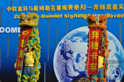 目前世界經濟危機仍在繼續,360臺的奔馳底盤的采購也正是說明了中聯重科對于2010年的混凝土機械市場持積極樂觀態度,也是體現了中聯重科作為世界最大的混凝土機械制造企業的大家風范。戴母勒公司表示此次簽約是金融危機里的冬日暖陽,令戴姆勒公司欣喜,公司非常重視這個簽約儀式.以戴姆勒東北亞投資有限公司董事長兼首席執行官華立新為領隊的多位高管參加了簽約儀式,華立新先生表示能與中聯合作是件愉快的事情,希望能持續合作,為中國的建筑機械產業做出貢獻。