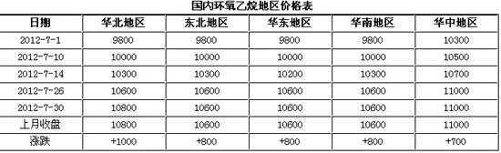 2、進入7月份國內環氧乙烷裝置檢修集中,遼陽石化檢修10天,中沙裝置因意外故障開車后環氧乙烷含醛量高,導致產量縮減,另外,因北京遭遇災情,運輸出現障礙,華北地區環氧乙烷負荷都有降低,當地供應面緊俏明顯;揚子石化環氧乙烷裝置自中旬進入檢修期,另外遼寧北化裝置月底進入檢修期,所以市場供不應求狀態十分明顯;