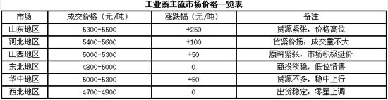 各地市場(chǎng)方面,山東地區(qū)主流現(xiàn)匯商談價(jià)格在5300-5500元/噸之間,零星高位商談價(jià)格在5600-5700元/噸;河北地區(qū)主流報(bào)盤(pán)在5400-6000元/噸之間,主流商談價(jià)格在5400-5600元/噸之間,部分高位商談在5700元/噸附近;華中地區(qū)商談價(jià)格維持在5000-5300元/噸之間,廠家惜售意愿較濃;山西地區(qū)市場(chǎng)商談多在5000-5300元/噸之間;東北地區(qū)主流商談價(jià)格在4800-5000元/噸之間;西北地區(qū)主流商談價(jià)格在4700-4900元/噸之間。