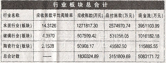 在建材行業資金普遍趨緊的環境下,建材上市公司是否也同樣面臨著困境?抑或會比一般性企業有所緩解?為此,本報對建材行業的三大主要子行業的48家上市公司進行了統計,統計對象包括上市公司的應收賬款、應付賬款、應收賬款周轉率及現金流等。