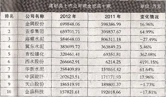 應付賬款前十具體排名情況為:金隅股份56.55億元,同比增加25.57%;海螺水泥48.11億元,同比去年增加25.57%;冀東水泥33.42億元,同比增加12.55%;華新水泥22.47億元,同比增加1.93%;天山股份21.38億元,同比增加38.75%:亞泰集團19.73億元,同比增加22.52%;南玻A 12.85億元,同比增加24.42%;祁連山8.80%,同比增加25.88%;中國玻纖8.21億元,同比增加24.65%:金晶科技7.85億元,同比增加75.84%。