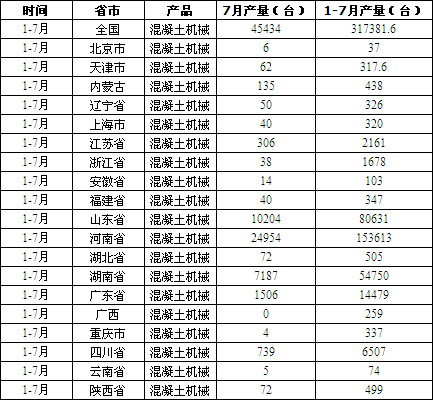 2012年1-7月中國(guó)混凝土機(jī)械產(chǎn)量數(shù)據(jù)統(tǒng)計(jì)(分省市)