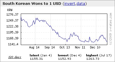 11月紐約商品交易所(NYMEX)的原油價格持續保持在75~80美元/桶之間振蕩,未能有明確的方向,在前期的大漲過后暫失上行動力,但亦表現較為抗跌,10月份時原油的大幅上漲使得油價重心大幅抬升,今年NYMEX原油價格最高點一度上探至82美元/桶。11月份原油也幾度試圖突破關鍵阻力位80美元/桶,但均無功而返,而在下探至接近75美元/桶一線時,亦表現出較強的支撐。11月份原油價格在振蕩區間之內經常性地出現暴漲暴跌;(如圖2)韓元兌美元匯率大幅下跌(如圖1)。預計聚醚進口價格將有小幅的上調空間。