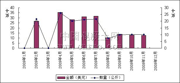 09年11份湖石化進口聚醚投入金額為127.6萬美元,本月較上月環比減少了2.52個百分點;08年11份湖石化進口聚醚投入金額為218.4萬美元,較去年同比減少了41.57%。