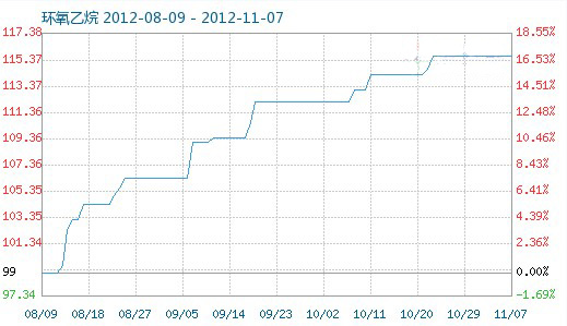 11月7日環(huán)氧乙烷商品指數(shù)為115.71,與6日持平,創(chuàng)下周期內(nèi)的歷史新高,較2012年07月18日最低點(diǎn)87.15點(diǎn)上漲了32.77%。(注:周期指2012-01-04至今)