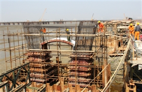 記者近日從泉州灣跨海大橋蚶江互通段施工現(xiàn)場(chǎng)獲悉,該合同段主線橋已于近日開始混凝土澆筑作業(yè),混凝土通過管道從施工橋上的混凝土罐車源源不斷地輸送至主線橋施工平臺(tái)。據(jù)介紹,泉州灣跨海大橋蚶江互通段主線橋全長(zhǎng)1200M,上部結(jié)構(gòu)為分離式現(xiàn)澆連續(xù)箱梁,斷面形式復(fù)雜多樣,施工荷載大,技術(shù)水平高,因此該合同段主線橋的混凝土箱梁施工投放兩臺(tái)了MSS50型移動(dòng)模架。圖為施工人員正在對(duì)橋墩實(shí)施鋼筋架構(gòu)作業(yè),為下步的混凝土澆筑做準(zhǔn)備。