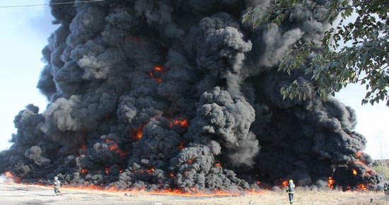由于當時無風,煙霧和火苗直接往上竄,并未危急到鄰側的磚廠和糧食倉庫,此時火焰已向上沖出300多米高,記者在200米范圍內,身體感受到明顯燒灼感覺。從遠處觀看,滾滾濃煙直沖云霄,由于當時無風,該區域上空竟如原子彈爆炸的情景一般,形成巨大類似蘑菇形狀的黑云。