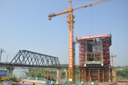 中鐵十局云桂鐵路廣西段重點控制性工程--平果右江特大橋首件連續梁18#水中墩0#塊日前開始澆注,掀起云桂鐵路復工建設新高潮。