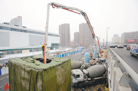 12月17日中午,記者在北海“姊妹橋”建設現場看到,高高的水泥罐車“穿”著棉襖,正為在暖棚中的第六根墩柱進行混凝土澆筑,僅僅兩個小時,就讓空空的墩柱“吃”得飽飽的,讓墩柱“長”到5米高。