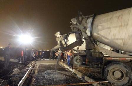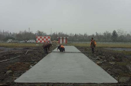 2012年12月13日凌晨0點,六輛滿載標準商品混凝土的水泥罐車,在成都雙流機場交警執勤車輛引導下,有序地進入新20R航向天線陣對新天線陣地基進行混凝土不間斷澆注,歷時3個半小時完成澆注;并于上午10點時,完成基礎面校準收尾工作。