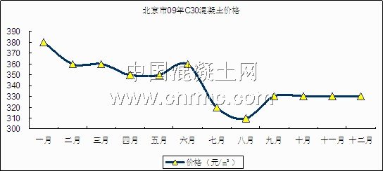 09年北京市混凝土平均價格走勢比較平穩。北京市混凝土協會在09年上半年對C30混凝土指導價定為350、360元/ m3,其它等級差別在15~20之間。根據市場情況來看,由于大多數建筑工程尚未完全啟動,原材料價格上漲,所以價格有點偏高,到09年下半年北京市混凝土協會對C30混凝土指導價定為320、330元/ m3,和去年的價格相比沒有太大變化。09年北京市C30混凝土價格走勢圖如圖一。