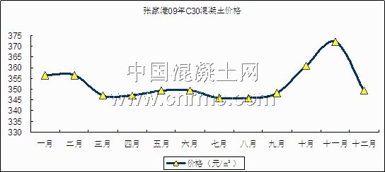 張家港C30成交價格一直在350元左右徘徊。從總體看,2009年,江蘇的混凝土市場發展勢頭不減,作為華東的強勢板塊主導江蘇市場的格局在近三、五年仍不會改變,隨著基本建設速度的不斷加快和相關配套政策的到位,江蘇混凝土行業將得到持續快速發展。見圖四混凝土價格走勢圖。
