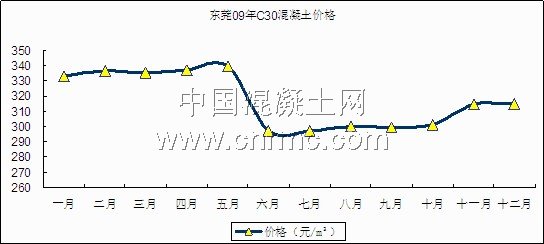 09年廣東混凝土市場價格相對08年相比小幅下降,東莞市09年上半年C30混凝土市場平均價在330元/ m3左右,由于水泥價格已比去年同期上漲60%,所以各種強度預拌混凝土之間的價格級差應相應加大,如C30—C50(每相應增加C5級差)段的砼價級差應由原來的10—15元/m3調整為15—25元/m3。下半年由于原材料價格相應下降,C30混凝土市場價在300元/m³左右。見圖五C30混凝土價格走勢圖。
