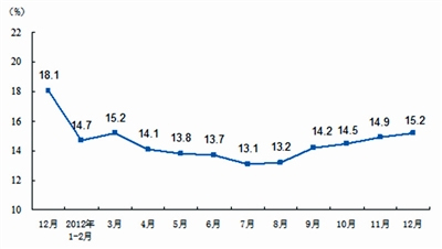 另外,2012年12月的社會消費品零售總額為20334億元,同比名義增長15.2%(扣除價格因素實際增長13.5%,以下除特殊說明外均為名義增長)。其中,限額以上企業(單位)消費品零售額10773億元,增長15.3%。1月~12月份,社會消費品零售總額207167億元,同比名義增長14.3%(扣除價格因素實際增長12.1%)。從環比看,12月份社會消費品零售總額增長1.53%(見表4)。