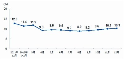 2012年12月份,規模以上工業增加值同比實際增長10.3 %(以下增加值增速均為扣除價格因素的實際增長率),比11月份加快0.2個百分點。從環比看,12月份,規模以上工業增加值比上月增長0.87%。1月~12月份,規模以上工業增加值同比增長10.0%。分季度看,一季度同比增長11.6%,二季度增長9.5%,三季度增長9.1%,四季度增長10.0%(見表3)。
