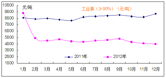 2012年,我國(guó)工業(yè)萘產(chǎn)品的累計(jì)均價(jià)為5625元/噸,同比下降37.2%。