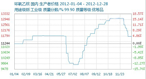 三、10月環氧乙烷價格沖刺最高峰,為13200元/噸。然11月開始,下游行業逐步進入淡季,加之部分產商增加環氧乙烷產量,對后期價格走勢不利。隨著上游原料及下游乙醇胺、氯化膽堿、表面活性劑等產品價格雙雙走跌后,環氧乙烷價格陸續跟跌。