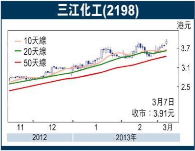 同屬化工產品板塊概念股的中國三江精細化工(2198),在昨日淡市下的表現也頗見亮麗,更曾創出3.98元的上市新高,收市報3.91元,仍升0.14元或3.71%,成交增逾8倍至7,218萬元,該股將于3月19日公布2012年全年業績,近日獲大成交攀高,似偷步炒業績。