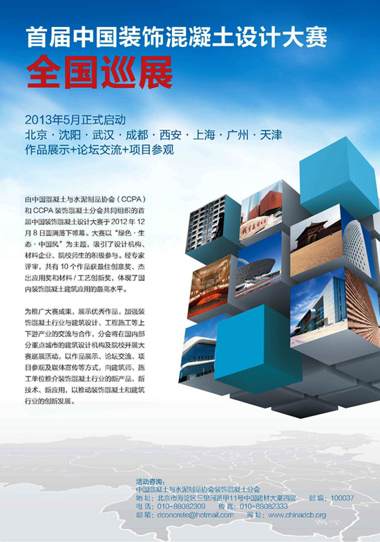 由中國混凝土與水泥制品協會裝飾混凝土(CCPA)和CCPA裝飾混凝土分會共同組織的首屆中國裝飾混凝土設計大賽于2012年12月8日圓滿落下帷幕。為推廣大賽成果,展示優秀作品,加強裝飾混凝土行業與建筑設計、工程施工等上下游產業的交流與合作,分會將在國內部分重點城市的建筑設計機構及院校開展大賽巡展活動。
