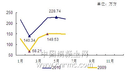據重慶市混凝土協會統計,該地區統計范圍內67家混凝土企業1-6月份共完成混凝土1210.7萬方,較去年上半年同比增長56.19%。預計今年下半年該市混凝土產量仍將保持高位增長(見圖一)。