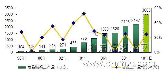 從近幾年該地區預拌混凝土產量增長走勢圖來看(見圖二)。2008年、2009年連續兩年該區域混凝土產量變化不大,但根據重慶市混凝土協會統計,今年上半年該市預拌混凝土產量已達到1210萬方,預計全年產量將突破3000萬方。由此,單從產量增長趨勢來看,重慶市混凝土行業將迎來歷史性的突破。