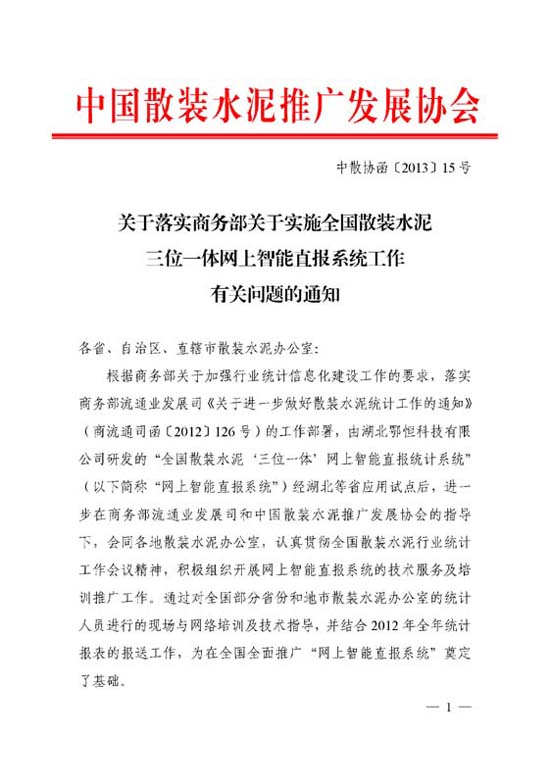 關(guān)于落實(shí)商務(wù)部關(guān)于實(shí)施全國(guó)散裝水泥三位一體網(wǎng)上智能直報(bào)系統(tǒng)工作有關(guān)問(wèn)題的通知