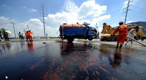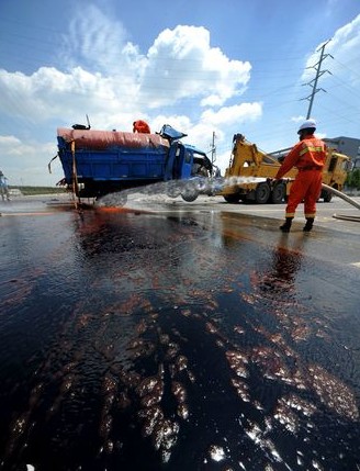 3日上午10點半左右,記者趕到事發現場,槽罐車已經被吊起,副駕駛一側嚴重變形,車后罐體裂開,大量褐色的液體汩汩地流出來。兩名消防人員扛著高壓水槍,對地面上的紅色液體進行稀釋,記者也濺了一身紅色液體。現場則形成了一條上百米長的“紅河”。