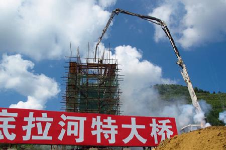 7月14日上午,中國中鐵四局集團二公司織畢鐵路三分部大型混凝土泵車在貴州織(金)畢(節)鐵路第二標段底拉河特大橋工地上澆筑橋墩混凝土。這是織(金)畢(節)鐵路和織(金)以(納)鐵路兩條線率先澆筑第一橋墩混凝土,標志著全線基礎施工正式拉開序幕。