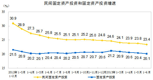 2013年1-6月份,全國民間固定資產投資115584億元,同比名義增長23.4%(扣除價格因素實際增長23.4%),增速比1-5月份回落0.4個百分點。民間固定資產投資占固定資產投資的比重為63.7%。